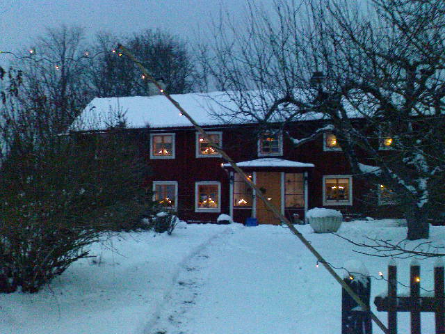 Gnistrande snö. marschaller som lyser upp gången och alla fönster i hela
